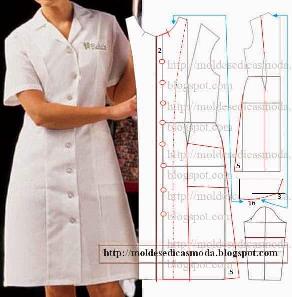 O molde base não tem valor de costura, tem que ser acrescentado. Este modelo fica bem com tecido ou tela em sarja ou outros materiais resistentes. Margem 5% (exemplo em um metro 5 cm de folga). Para confeccionar este modelo de bata de trabalho são necessários 2,5 metros de tecido. São necessárias duas ou uma altura de tecido conforme a largura da peça. Depois de ter feito o seu molde base de vestido é fácil fazer qualquer um destes lindos e elegantes modelos.