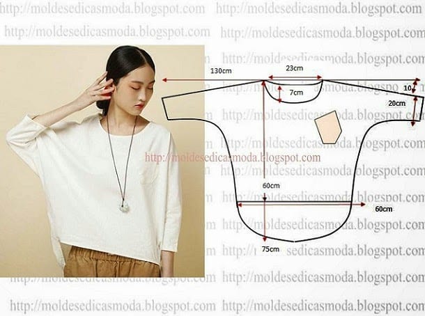 Este modelo fica bem com tecido ou tela em seda, malha, sable e cetim. Todos os tecidos que tenham bom caimento são adequados para fazer este modelo de blusa. É necessário 2 vezes a altura. Folga 5% (exemplo em um metro 5 cm de folga). Para fazer esta blusa descontraída de fácil corte necessita de 1,50 metros de tecido. São necessárias duas ou uma alturas de tecido conforme a largura da peça.