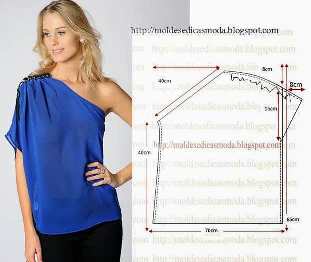 Este modelo fica bem em todos os tecidos que tenham bom caimento. É necessário 2 vezes a altura da blusa. Folga 5% (exemplo em um metro 5 cm de folga). Necessita de 1,40 metros de tecido para fazer esta blusa com uma manga só. São necessárias duas ou uma alturas de tecido conforme a largura da peça.