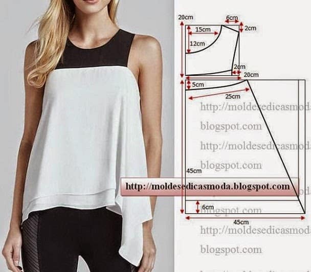 Com base na imagem desenhe o molde de blusa com alça. A ilustração do molde de blusa não tem valor de costura. Observe atentamente ...