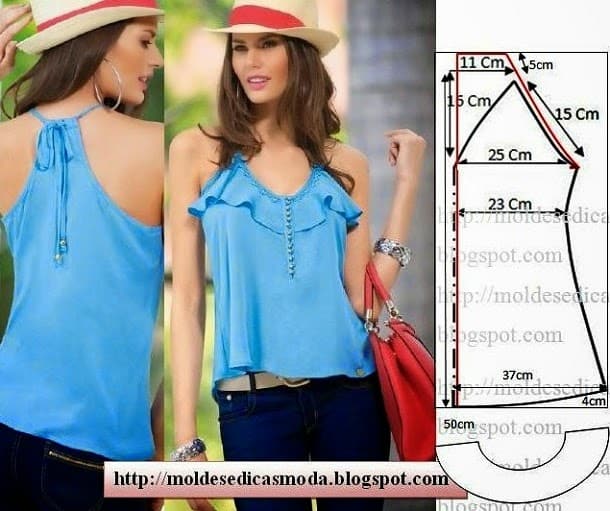 O molde não tem valor de costura, tem que ser acrescentado. Este modelo fica bem com tecido ou tela em seda, malha, sable, organza e cetim. Todos os tecidos que tenham bom caimento são apropriados para confeccionar este modelo de blusa. É necessário 1 metros de tecido para fazer esta blusa com babado no decote. Folga 5% (exemplo em um metro 5 cm de folga). São necessárias duas ou uma alturas de tecido conforme a largura da peça.