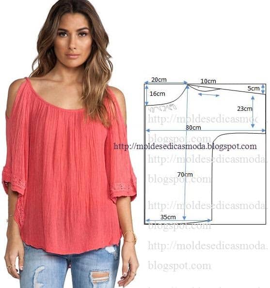 Blusa descontraída e casual assim podemos designar esta blusa com ombro de fora. Esta blusa foi costurada com "chiffon plissado" mas se pretender pode usar outro tipo de tecido.