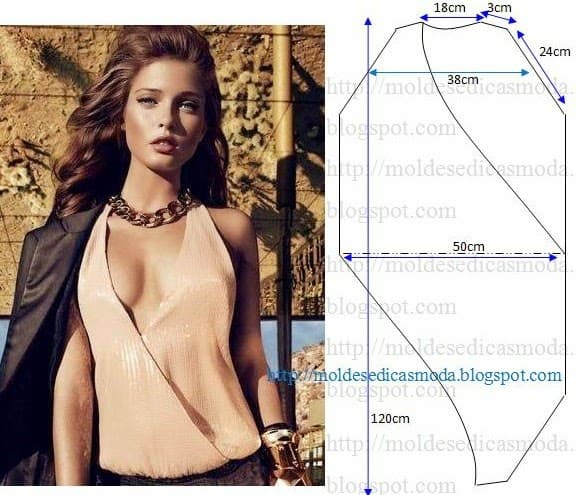 O molde não tem valor de costura, tem que ser acrescentado. Este modelo fica bem com tecido ou tela em seda, malha, sable, organza, cetim e todos os tecidos que tenham bom caimento. É necessário 1,5 metros de tecido para fazer esta blusa feminina transpassada. Folga 5% (exemplo em um metro 5 cm de folga). São necessárias duas ou uma altura de tecido conforme a largura da peça.