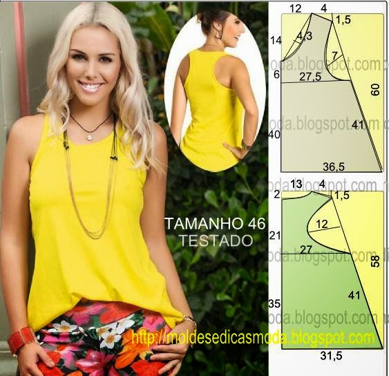 O molde da blusa regata feminina encontra-se no tamanho 46 tabela de medidas Portuguesa e 48 na tabela de medidas Brasileira. O molde não tem valor de costura.