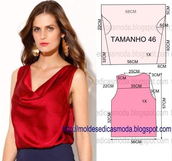 Este modelo fica bem com tecido/tela em seda, malha, sable, organza, cetim e todos os tecidos que tenham bom caimento. É necessário 1,30 metros de tecido. Folga 5% (exemplo em um metro 5 cm de folga). São necessárias duas ou uma alturas de tecido conforme a largura da peça. O corte e costura da blusa drapeada vermelha é simples. Faça a roupa à sua medida, o processo é simples e divertido.