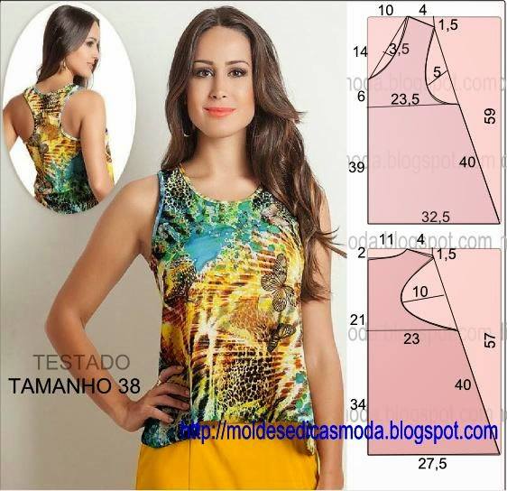 O molde de blusa regata encontra-se no tamanho 38 na tabela de medidas Portuguesa e tamanho 40 na tabela de medidas Brasileira. A ilustração do molde blusa não tem valor de costura.