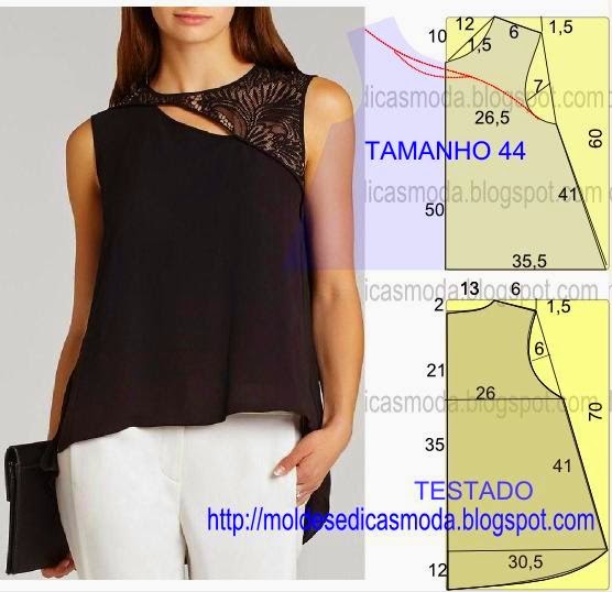 Este modelo de blusa/camisola de senhora, fica bem com tecido/tela em seda, malha, sable, organza, cetim e todos os tecidos que tenham bom caimento. É necessário 1,50 metros e 25 cm de renda. Folga 5% (exemplo em um metro 5 cm de folga). São necessárias duas ou uma alturas de tecido conforme a largura da peça. O molde de blusa com aplicação de renda encontra-se no tamanho 44 Portugal e 46 Brasil. A ilustração do molde blusa não tem valor de costura.