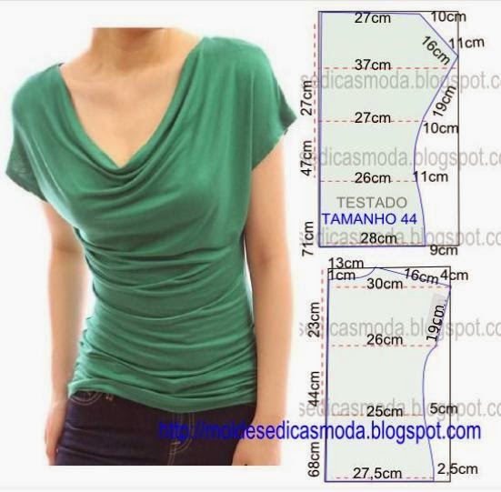 Este modelo de blusa ou camisola de senhora, fica bem com tecido vs tela com bom caimento. Como por exemplo seda, malha, sable, organza, cetim. É necessário 1,40 metros de tecido para fazer esta blusa com drapeado na gola. Folga 5% (exemplo em um metro 5 cm de folga). Para fazer esta blusa são necessárias duas ou uma alturas de tecido conforme a largura da peça.