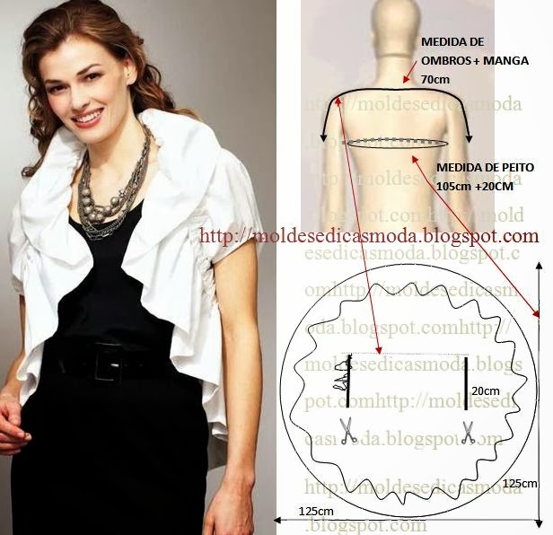 Com certeza quando o vestir não vai passar despercebida junto das suas amigas. A escolha do tecido é fundamental para que o efeito final seja fantástico. Para efectuar este trabalho só tem que cortar um circulo com a medida do peito mais o babado ou folho. Dobre o circulo ao meio e marque metade da medida das costas. Faça uma abertura com cerca de 20 cm para passar os braços. Em meu entender devem testar o molde antes de cortar no tecido a não ser que tenham muita prática no corte e costura de roupa. Faça a leitura da imagem para melhor compreender como fazer o bolero ao seu tamanho.