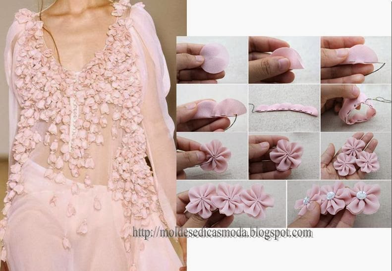 Enriqueça o tecido com aplicações de flores em tecido. A imagem documenta o passo a passo para fazer estas flores.