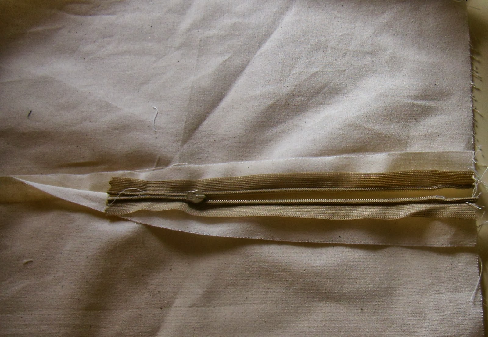 Pregar o fecho começando pelo topo da costura e terminando 2 cm a baixo do limite do fecho ou ziper (os 2 cm são para facilitar a passagem do cursor do fecho ou ziper). Com a ajuda de uma tesoura desenrole o fecho ou ziper e costure o mais próximo possível dos dentes do ziper.