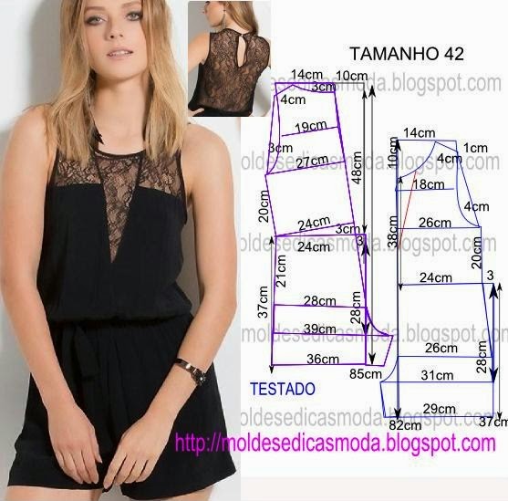 O molde de macacão preto com renda encontra-se no tamanho 42 Portugal e 44 Brasil. Faça o molde com base nas medidas da imagem. As medidas deste molde é semi-justo.