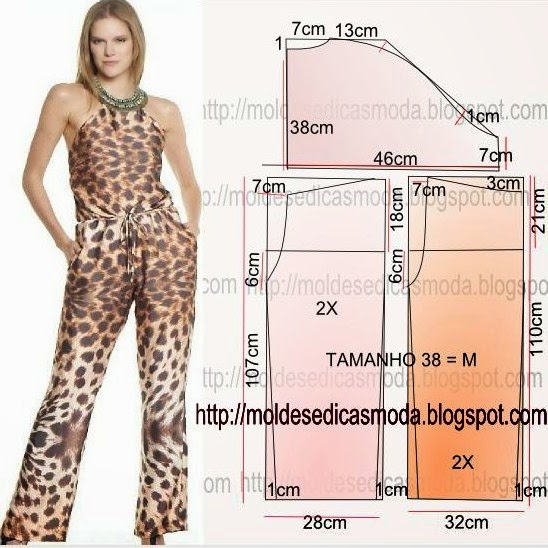 Faça o molde do macacão estampa de onça, com base nas medidas da imagem. O grau de dificuldade de costura é baixo. Faça o molde em papel e recorte. As medidas deste molde é semi-largo.