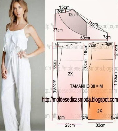 Faça o molde deste macacão branco com babado, com base nas medidas da imagem. As medidas desta imagem correspondem ao molde semi-largo.