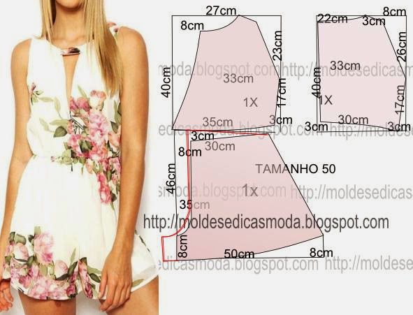Faça o molde deste macacão curto floral, com base nas medidas da imagem. O grau de dificuldade de costura é baixo. As medidas deste molde é semi-largo.