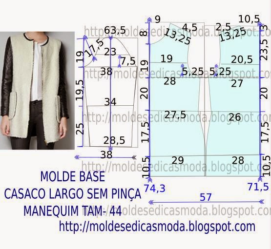 Como traçar ou desenhar um modelo. Este molde base de casaco é o desenvolvimento em plano das formas do manequim para todas as medidas. Tome como referência o quadro de medidas tamanho 44 na tabela de medidas Portuguesa e tamanho 46 na tabela de medidas Brasileira. Desenhe o molde em papel para dissipar algumas dúvidas que possam surgir no seguimento da execução do molde base.