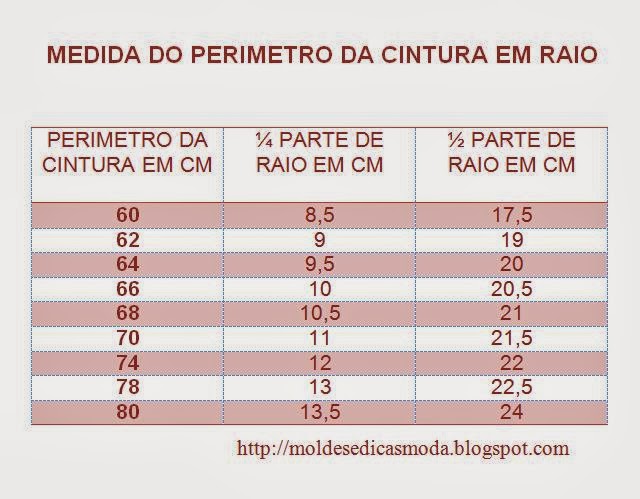 Esta tabela de medidas do perímetro da cintura em raio é utilizada para fazer os vestidos em godé. Sempre que pensar fazer uma saia em godé tome a medida da sua cintura e compare com as medidas da tabela.