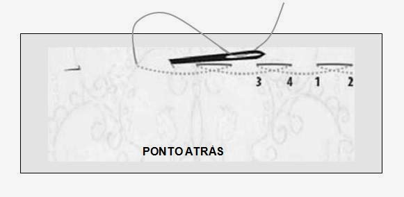 PONTO ATRÁS - É um ponto de costura bem forte, usado para refazer costuras desfeitas. Comece por trazer a agulha do nó para o ponto 1. Insira a agulha no tecido no ponto 2 e por trás traga para o ponto 3. Volte atrás para o ponto 4 e recomece o movimento passando a agulha por trás do tecido.