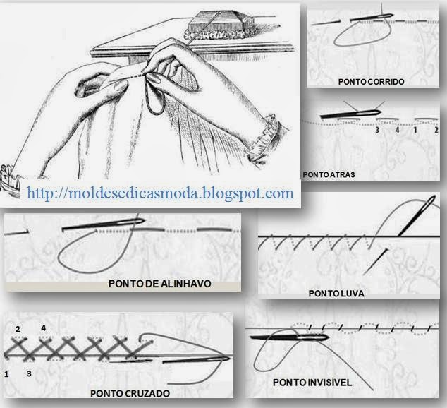 PONTO INVISÍVEL - Feito com uma costura bem baixa. Usa-se para unir duas bordas dobradas de tecido ou uma borda dobrada e uma bainha. E ainda para dar pontos finais em peças de artesanato. Devemos passar as dobras a ferro e esconder o nó na parte dobrada. Trazemos a agulha para a frente, pegamos poucos fios de tecido e retornamos para dentro da dobra. Voltamos com a agulha para fora e repetimos sucessivamente. A costura não deve aparecer pelo lado de fora, e os pontos maiores ficam do lado do avesso.