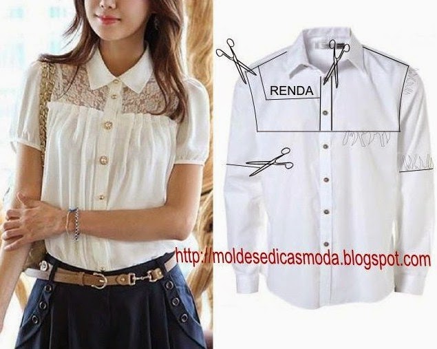 Vasculhe o guarda roupa dos homens da casa e faça a reciclagem de camisa de homem com renda. Este modelo de reciclagem tem um efeito final em termos design muito delicado e rico.