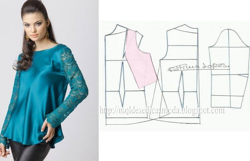 O molde base não tem valor de costura, tem que ser acrescentado. O blog tem moldes base grátis para imprimir. Imprima em tamanho A4 e cole as folhas. Depois de colar as folhas recorte com recurso a uma tesoura e faça as alterações que a imagem sugere. Para imprimir o molde base tamanho médio clique aqui ou aqui para tamanho grande. Faça a gradação para o seu tamanho aqui, porque o processo é simples. blusa em viscose e renda