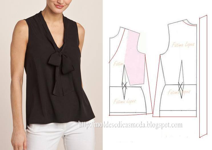 O molde base não tem valor de costura, tem que ser acrescentado. Se pretender um evasê maior tem que prender no ombro e abrir mais na cinta. Para imprimir o molde base tamanho médio clique aqui ou aqui para tamanho grande e faça a gradação para o seu tamanho aqui, porque o processo é o mesmo. O grau de dificuldade de execução desta blusa laço no decote é pouco elevado. Seja persistente só assim vai poder dominar esta arte tão nobre.