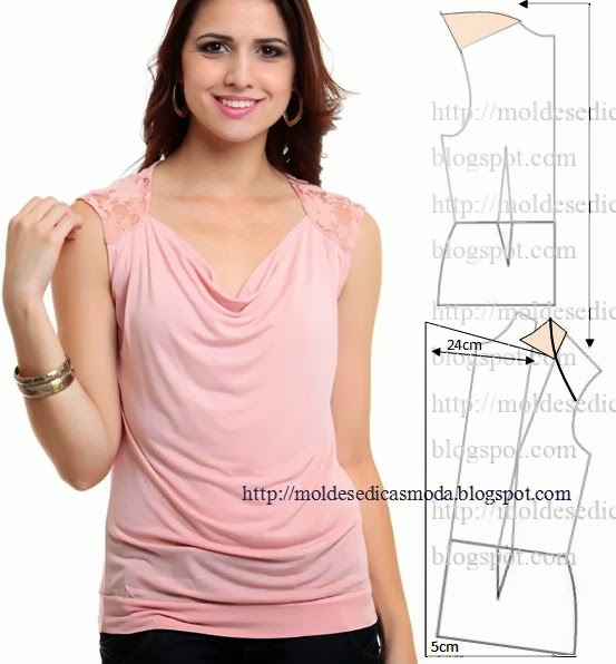 A proposta de hoje recaiu sobre esta bela blusa rosa com gola drapeada. Para fazer o molde siga o passo a passo que se encontra em baixo descrito com rigor para facilitar o trabalho.