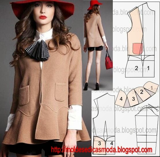 O molde base não tem valor de costura, tem que ser acrescentado. Este modelo fica bem com tecido/tela em chifon, linho, musseline e tecidos encorpados etc . É necessário 2 vezes a altura do casaco uma altura da manga mais folga 5% (exemplo em um metro 5 cm de folga). Para fazer este modelo necessita de 2,50 metros de tecido. Faça o molde base e a gradação para o seu tamanho recorrendo aos links em baixo. O casaco moderno feminino tem um grau de dificuldade elevado. A parte do babado para que fique perfeito exige conhecimento.