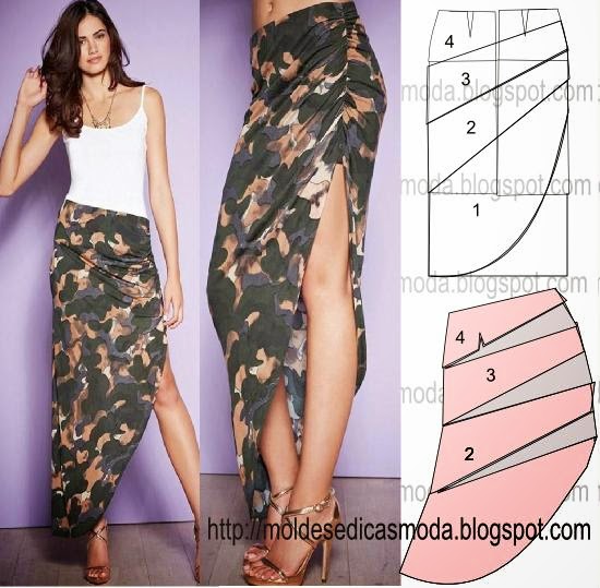 O molde base não tem valor de costura, tem que ser acrescentado. Este modelo fica bem com tecido/tela em seda, sable, cetim e todos os tecidos que tenham bom caimento. É necessário 1,30 metros. Folga 5% (exemplo em um metro 5 cm de folga). São necessárias duas ou uma alturas de tecido conforme a largura da peça. Com este link pode fazer o molde da saia camuflada à sua medida.