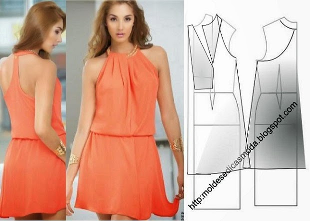 O molde base não tem valor de costura, tem que ser acrescentado. Este modelo fica bem com tecido/tela em seda, renda, malha, veludo, sable, cetim, organza e todos os tecidos que tenham bom caimento. Folga 5% (exemplo em 1 metro 5 cm de folga). Para confeccionar este modelo são necessários 2,20 metros de tecido. São necessárias duas ou mais alturas de tecido conforme a largura da peça. Depois de ter feito o seu molde base de vestido é fácil fazer este lindo e elegante vestido curto laranja ao seu tamanho. Para facilitar use os links em baixo.