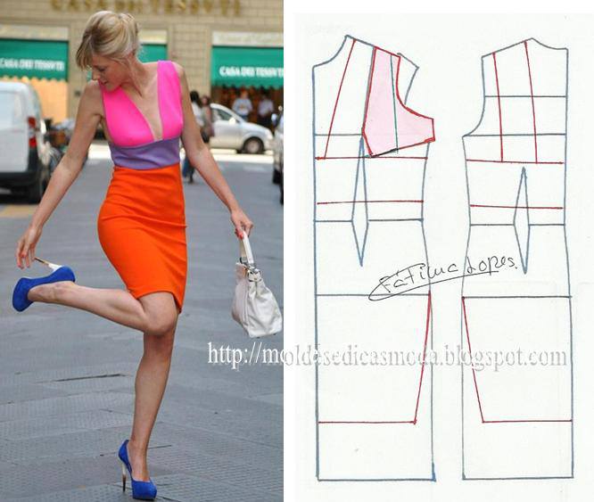 Como exemplifico nesta publicação existem modelos de vestido tres cores que ficam muito elegantes. Os moldes de roupa que esta página disponibiliza são grátis.
