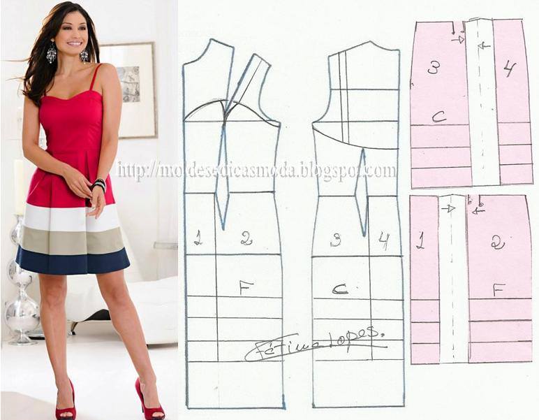 O molde base de vestido não tem valor de costura, tem que ser acrescentado. Este modelo de vestido fica bem com tecido ou tela em seda, renda, malha, veludo, sable, cetim e organza. Todos os tecidos que tenham bom caimento são adequados para fazer este modelo. Folga 5% (exemplo em um metro 5 cm de folga). Para fazer este vestido necessita 1, 20 metros de tecido vermelho e 20 cm de cada cor (branco, beije e azul marinho, neste caso). Clique nos links em baixo para facilitar o molde do vestido com alças ao seu tamanho.