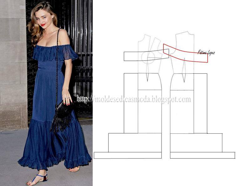 Nota: o molde base não tem valor de costura, tem que ser acrescentado. Não se esqueça que a escolha do tecido é fundamental para obter o efeito desejado. Faça o seu molde base, para isso clique nos link's por baixo da imagem. Depois de fazer o seu molde base siga as instruções da descrição para fazer as alterações que a imagem sugere. Moldes de roupa grátis prontos a imprimir e costurar na parte superior "menu" do blog. Faça o seu molde de vestido longo com ombro vazado com a ajuda dos links em baixo.