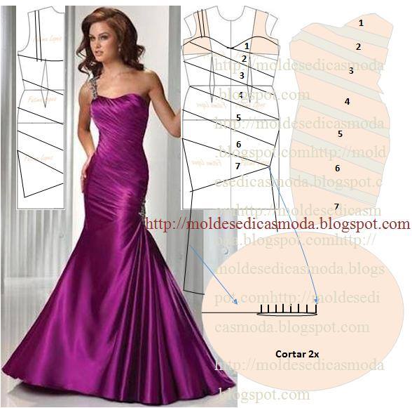 O molde base não tem valor de costura, tem que ser acrescentado. Este modelo fica bem com tecido ou tela em seda, malha, veludo, sable, cetim e organza. Todos os tecidos que tenham bom caimento são adequados para fazer este modelo de vestido. É necessário 3 vezes a altura. Folga 5% (exemplo em um metro 5 cm de folga). Para fazer este vestido de festa roxo necessita de 6 metros de tecido. São necessárias duas ou uma alturas de tecido conforme a largura da peça. Faça o seu molde base de vestido clicando nos links em baixo.