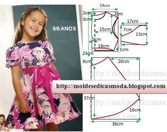 Nota: Este modelo fica bem com tecido/tela em seda, malha, algodão, organza, cetim e todos os tecidos que tenham bom caimento. É necessário 2 metros de tecido. Folga 5% (exemplo em um metro 5 cm de folga). São necessárias duas ou uma alturas de tecido conforme a largura da peça. O molde de vestido de criança florido não é difícil de executar embora precise de alguma experiência.