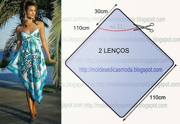 Lindo e de belo efeito este vestido de lenços de fácil corte e costura. Use dois lenços e faça este belo vestido. Gosto desta ideia de costurar vestidos a partir de lenços.