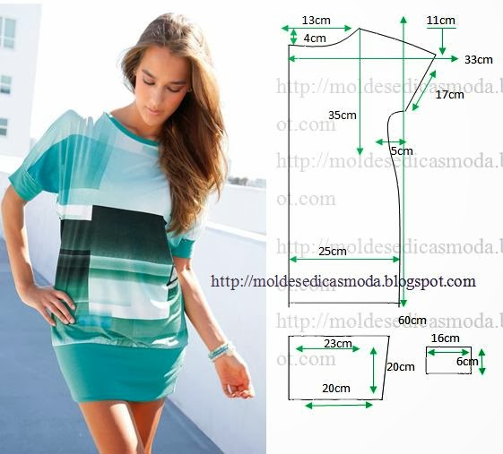 Vestido fácil de fazer elegante de cores frescas e linhas simples. As medidas facilitam a modelagem deste lindo modelo. Estas medidas correspondem ao tamanho 38/40 na tabela de medidas Portuguesa. Na tabela de medidas Brasileira correspondem ao tamanho 40/42. Escolha um bom tecido, de preferência malha ou tecido que tenha bom caimento. São necessários 1,5 metros de tecido para fazer este modelo. Faça o molde do vestido em papel, para poder fazer os acertos necessários.