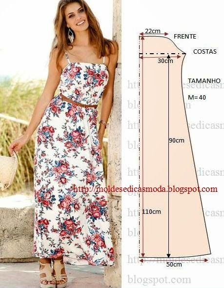 Este modelo fica bem com tecido ou tela em seda, malha, sable, organza, cetim e todos os tecidos que tenham bom caimento. É necessário 2,20 metros para fazer o vestido floral comprido. Folga 5% (exemplo em um metro 5 cm de folga). São necessárias duas ou uma alturas de tecido conforme a largura da peça.