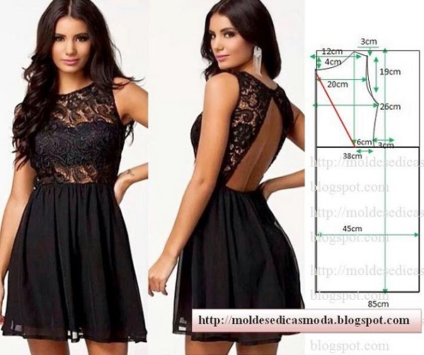 As medidas do molde não têm margem de costura, tem que ser acrescentada. Este modelo fica bem com tecido ou tela em seda, malha, sable, organza, cetim e todos os tecidos que tenham bom caimento. É necessário 1,50 metros de tecido para fazer o vestido preto com tecido e renda. Folga 5% (exemplo em um metro 5 cm de folga). São necessárias duas ou uma alturas de tecido conforme a largura da peça.