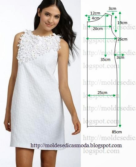 Este modelo fica bem com tecido ou tela em seda, malha, sable, organza, cetim e todos os tecidos que tenham bom caimento. É necessário 1 metro de tecido para fazer este vestido branco com aplicações. Folga 5% (exemplo em um metro 5 cm de folga). São necessárias duas ou uma alturas de tecido conforme a largura da peça. As aplicações do peito do vestido podem ser feitas com tiras em viés. As medidas correspondem ao tamanho 38 na tabela de medidas Portuguesa. Na tabela de medidas do Brasil corresponde ao tamanho 40.