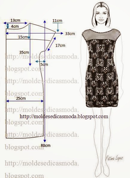 Este modelo fica bem com tecido/tela em seda, malha, sable, organza, cetim e todos os tecidos que tenham bom caimento. É necessário 2 metros de tecido. Folga 5% (exemplo em um metro 5 cm de folga) são necessárias duas ou uma alturas de tecido conforme a largura da peça. As medidas do vestido com renda em cima correspondem ao tamanho 38 na tabela de medidas Portuguesa e 40 na Brasileira.