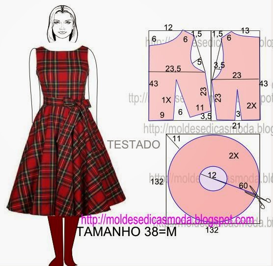 As medidas deste molde de vestido godé tecido escocês não incluem a margem de costura. O molde corresponde ao tamanho 38 na tabela de medidas Portuguesa e ao tamanho 40 na tabela de medidas Brasileira.