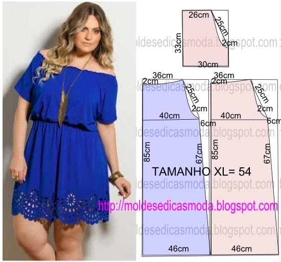 O molde de vestido decote de barco encontra-se no tamanho 54 que corresponde ao XL. A ilustração do molde vestido não tem valor de costura tem que ser acrescentado.